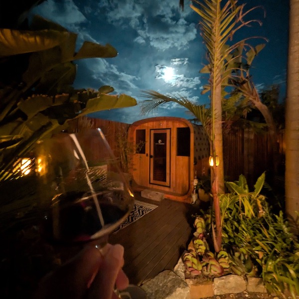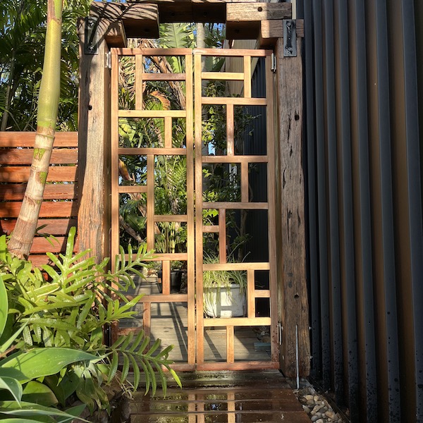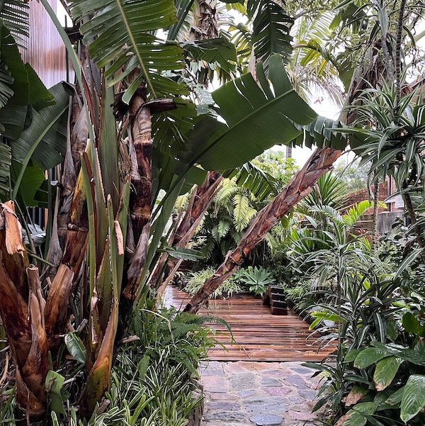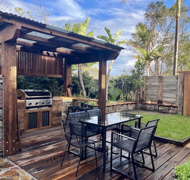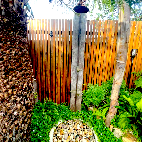 Outdoor sauna, shower, BBQ, and tropical gardens.